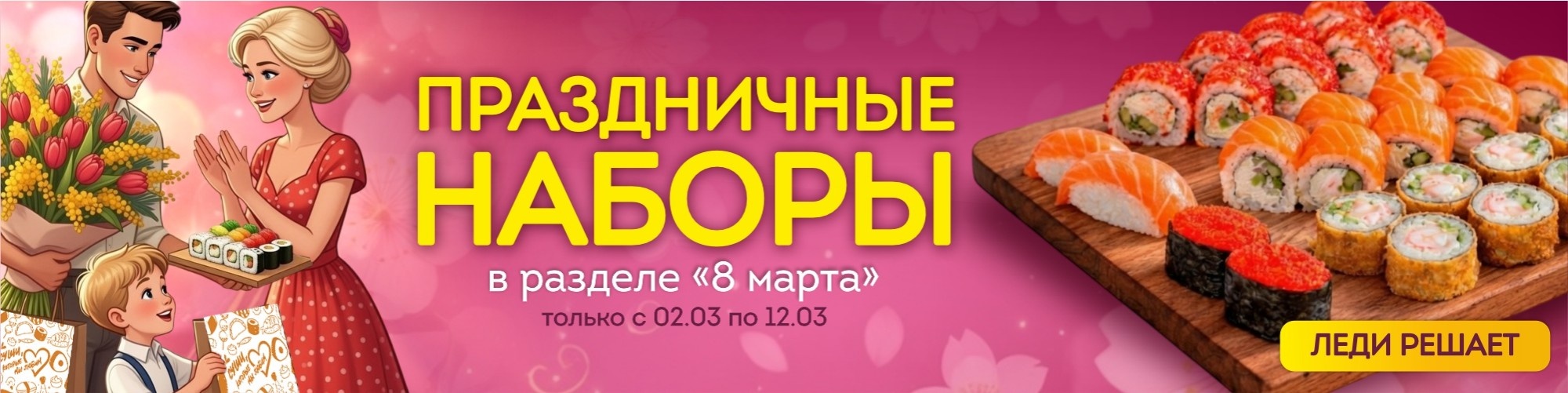 Фэнтези ролл 1/2,фэнетези запеченный 1/2, калифорния в кунжуте 1/2, калифорния классика 1/2, филадельфия темпура 1/2, филадельфия темпура запеченная 1/2, маки с лососем и авокадо 1/2, маки с тунцом 1/2.